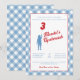 Una clásica invitación de upsherin azul y roja a cuadros, con un patrón de gingham azul en la parte posterior.
