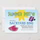 Esta invitación a la barbacoa, fiesta de verano y patio trasero, ofrece un diseño de colores vivos que incluye sol, chanclas, gafas de sol y sandía. El texto de personalizable le permite añadir los detalles de su fiesta.