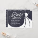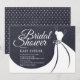Una invitación chic para la despedida de soltera que presenta un elegante vestido de novia, hermoso texto en letra script y todos los detalles especiales de la despedida de soltera totalmente personalizados en un fondo de pizarra. El reverso presenta un fondo a juego con un patrón de lunares.