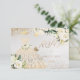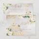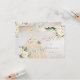 PixDezines elegante quinceañera RSVP con flores de acuarela en crema de alabastro y exuberante follaje verde, un vestido dorado brillante con brillos dorados.