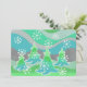 Un moderno y estilizado paisaje invernal con pinos espumosos y copos de nieve. Invitación con un diseño de personalizable verde, azul, plateado, gris y blanco para que usted pueda personalizar con su propio texto, imágenes e ideas. El texto puede cambiarse fácilmente utilizando la plantilla proporcionada o haciendo clic en el botón "Personalizar" para realizar más modificaciones. Dibujo de lápiz de colores realzados digitalmente por Jess Perry.