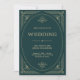 Estas glamorosas invitaciones a la boda cuentan con un giro moderno en el Art Deco clásico. Un marco geométrico y ornamental adornado con un dorado de champán adornan un elegante fondo verde esmeralda para una espectacular boda vintage.