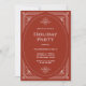 Estas elegantes invitaciones para fiestas de Navidades cuentan con un moderno giro en el arte clásico de la deco. Un marco geométrico y ornamental blanco ornamentado adornan un fondo rojo festivo para una estancia clásica pero glamurosa.