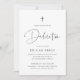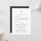 Invite a los huéspedes a celebrar la dedicación de su pequeña con estas invitaciones modernas y mínimas en blanco y negro clásico. El diseño sencillo incluye "Dedicación" en escritura manuscrita casual, con los detalles de su ceremonia y celebración debajo de las modernas letras negras de ceniza suave. Un pequeño y moderno ilustracion cruzado completa el diseño.