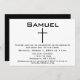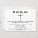 Invite a amigos y familiares a celebrar la dedicación especial de su hijo con estas elegantes y modernas invitaciones en blanco y negro. El diseño minimalista incluye una cruz simple con el nombre de su hijo/hija, acompañada de los detalles de su ceremonia y celebración. Tarjetas de devoción para bebés.