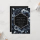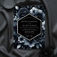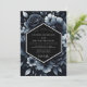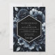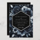 A dramatic design features opulent deep blue blossoms and dark foliage, creating a moody and sophisticated atmosphere. The rich color palette evokes a sense of timeless romance.