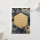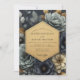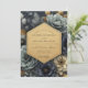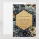 This design evokes a sense of moody romance with its dramatic and lush floral arrangement. Deep navy blues blend with soft grey and hints of golden ochre in opulent blooms, creating an enchanting atmosphere. The rich, velvety petals suggest a sophisticated and intimate celebration.