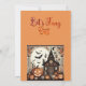"Let's Fang Out" - Una encantadora invitación a la Fiesta de Disfraces de Halloween para que se reúnan espeluznantes. El ilustracion tiene farolillos Jack O, murciélagos en el marco de una casa espeluznante y embrujada con un fondo de color ladrillo. El texto se puede personalizar fácilmente con su elección de palabras y estilo.