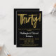 Una elegante, simple pero llamativa invitación para una fiesta de aniversario de bodas de oro número 30, de color negro y dorado. Texto con tipografía glamorosa en la parte superior y texto dorado debajo con el nombre en blanco resaltado