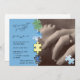 ¡Esta preciosa invitación de bebé es la manera perfecta de que todos compartan su alegría! El fondo es azul a la izquierda con una gran foto a la derecha. Entre ellas hay cuatro piezas de rompecabezas que crean un borde. ¡El texto es completamente personalizable!