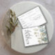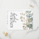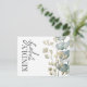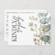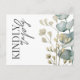 Agregue esta tarjeta postal RSVP única a su página de invitación. Este diseño presenta eucaliptos y follaje en color verde salado y beige pintado en acuarela. Al revés, hay espacio para que el cliente responda y su dirección de retorno.