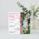 Una invitación de la fiesta de cumpleaños que ofrece una foto de una mariposa en derecho. La foto es blanco y negro con las salpicaduras del color. Borde rosado. Modifique el rosa, el negro, y el texto del verde para requisitos particulares con los detalles de su ocasión. El lado opuesto es rosa fuerte.