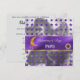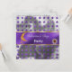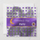 Una elegante invitación de papel de aluminio morado y plateado que presenta una luna naranja con un amuleto de cornalina de perla dorada, collares de corazones naranjas de cornalina dorada y estrellas moradas brillantes.