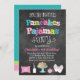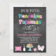 Nuestros originales, superventas, las crepes y los pijamas que la invitación de la fiesta de cumpleaños del estilo de la pizarra es la perfecta invitan para cualesquiera crepes y fiesta del tema del pijama. Nuestras características del diseño un fondo de la pizarra, una mezcla de letras de modelo de la diversión tales como lunares, las rayas y galón, los deslizadores del conejito, una pila de crepes, la botella de leche y un galón rosado soportan que se pueden modificar para requisitos particulares con el monograma o la edad de su niño.
