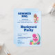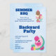 Una invitación a barbacoa de fiestas de patio trasero. Un bonito ilustracion flamingo con sandías y piña. .Los tratamientos con helados ilustran esta invitación veraniega. Fondo azul claro.