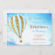 Este el globo del aire caliente tiene un fondo del cielo azul con un globo del aire caliente del azul y del oro en el lado izquierdo. ¡Dicen "para arriba, encima de y lejos! Únase a por favor nos para (nombre) (edad) el cumpleaños!" Todo en esta invitación se puede modificar para requisitos particulares para caber a su fiesta.