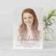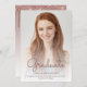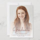 Moderna invitación de graduación con una foto vertical personalizado. La palabra "Graduado" aparece en un guión de escritura a mano de rosa oscuro, con el nombre del graduado, la escuela y el año de graduación debajo en letra sans serif. Reemplace fácilmente la imagen de muestra con la foto de su propio graduado. Una pantalla de degradado blanco ayuda a asegurar que aparece el texto. Agregue detalles sobre los logros de su graduado y planes futuros al revés, que presenta un rosa de oro que gotea un falso borde purpurina en un contexto sombrío.