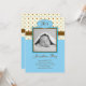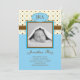 Invitación de encargo moderna del nacimiento para un muchacho. Añada su propia foto y palabras. Ofrece los monogramas de las iniciales del bebé y un fondo lindo de los lunares en azul y marrón. Con clase con todo juguetón.