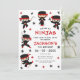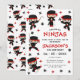 Celebra el momento alegre del cumpleaños temático Ninja Karate de tus niños pequeños con una encantadora invitación. Este encantador diseño presenta ninjas lindas con shurikens negros y rojos.