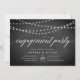 Nuestras elegantes invitaciones rústicas para participar en fiestas en blanco y negro cuentan con un fondo de pizarra con cuerdas de luces blancas en la parte superior, y "fiesta de compromiso" en la tipografía de guiones de caligrafía de moda. Personalice con sus detalles de celebración de compromiso debajo de blanco.