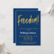 Una elegante, sencilla pero llamativa invitación a la fiesta de retiro en color azul marino y oro. Texto del guión de Glam en la parte superior que dice "¡Libertad!" con texto dorado debajo y el nombre en blanco sobresaliente.
