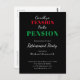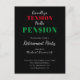 Una divertida invitación a un partido de retiro dice, adiós tensión hola pensión. Esta simple invitación tiene una tipografía audaz sobre un fondo negro. Nuestras plantillas son fáciles de usar, simplemente agregue el nombre y los detalles del fiesta en el frente y en el reverso, una dirección de retorno y texto adicional o un breve mensaje.