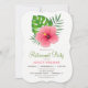 Invitación a la fiesta de retiro del Hibiscus Tropical Pink Flower de Verano. El Invite presenta flores rosas y hojas tropicales verdes.