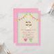 Invitación a una fiesta de cumpleaños con tema de fiesta de té. Invite tiene un ilustracion de dos puestos de macarons franceses en la parte superior. Personalice con edad en la parte superior del stand. Ilustracion de tintas rosas y verdes en la parte inferior. El Invite también cuenta con un sólido y gingham bunting en la parte superior y un fondo de gingham rosa. Personalice el texto con detalles de su ocasión.