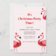 Invitación a una fiesta de Navidades con flamencos rosas vestidos con traje de Santa sobre un fondo rosado. Tómate un fiesta divertido y festivo con tantos flamencos como quieras. Feliz Navidad! Diseño de fiesta de invitados de fiesta de Navidades de Flamingo Rosa | ©Melissa Patton - Artista/Ilustrador