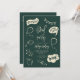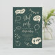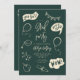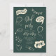 Funky tarjeta de invitación de fiesta de graduación con ilustracion a mano de graduación e íconos relacionados con la escuela en verde.
