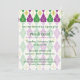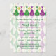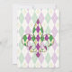 En esta invitación destacan los brillantes diamantes de color violeta y verde, con un contorno de diamante dorado, y el flur de lis, que recuerda la juerga y las celebraciones asociadas con el mardi gras de Nueva Orleans, mientras que una base crema aporta un toque de refinamiento a este patrón de argyle. La parte inferior de la tarjeta tiene un texto de ejemplo que puede personalizar para crear una invitación personalizada para su fiesta o evento, y la parte posterior incluye un flautista con patrones en un fondo de argyle desvanecido para ese último toque especial.