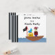 Una buena invitación de cumpleaños pirata con un barco pirata con un pirata y su coco de confianza vigilando el pecho del tesoro. Rayas negras y azules a un lado de la invitación. Personalizar con toda la información de su fiesta que desee.