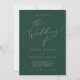 Esta delicada caligrafía dorada verde en una sola invitación es perfecta para un boda moderno. El romántico diseño minimalista presenta una encantadora y elegante tipografía de champán amarillo dorado sobre un fondo verde oscuro con un aspecto limpio y sencillo. Guarde el papel incluyendo los detalles en la parte posterior de la invitación a la boda en lugar de en una tarjeta separada. Incluya también la información de RSVP si su invitado responderá electrónicamente (opcional).