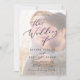 Esta delicada caligrafía negra descolorida invitación a la boda es perfecta para un boda moderno. El romántico diseño minimalista presenta una bonita y elegante tipografía negra con un aspecto limpio y sencillo. Personalice con dos fotos de compromiso, una en la parte delantera y otra en la parte trasera.