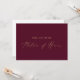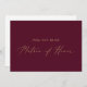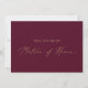 Esta delicada tarjeta de presentación de oro y matrona de borgoña es perfecta para un boda moderno. El romántico diseño minimalista presenta una encantadora y elegante tipografía de champán amarillo dorado sobre un fondo rojo burdeos con un aspecto limpio y sencillo. Personalizar la tarjeta con el nombre de la novia y la matrona de honor. Personaliza la parte posterior de la tarjeta con un mensaje personalizado.