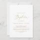Esta delicada invitación al bautismo de caligrafía dorada es perfecta para un bautismo moderno de bebé. El romántico diseño minimalista presenta una encantadora y elegante tipografía de champán amarillo dorado sobre un fondo blanco con un aspecto limpio y sencillo.
