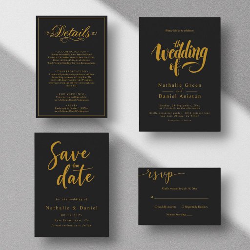 Invitación Delicado Boda De Estilo Negro Y Guión Dorado