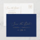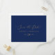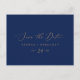 Este delicado oro y marina ahorran la postal de fecha es perfecta para un boda moderno. El romántico diseño minimalista presenta una encantadora y elegante tipografía de champán amarillo dorado sobre un fondo azul marino con un aspecto limpio y sencillo.