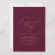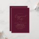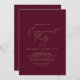 Esta delicada invitación a una fiesta de compromiso de oro y borgoña es perfecta para un evento de compromiso moderno. El romántico diseño minimalista presenta una encantadora y elegante tipografía de champán amarillo dorado sobre un fondo rojo burdeos con un aspecto limpio y sencillo.