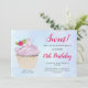 Una invitación de cumpleaños con una ilustración de un delicioso cupcake con remolinos rosas y una frambuesa con hojas en la crema. Sobre un fondo de acuarela pastel azul claro.