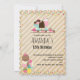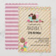Invitación de cumpleaños con fondo a rayas. Decorado con fresas y un tazón de helado y barra de helado y un flotante. Rodeado de puntos de confeti coloridos.