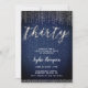 Una moderna, elegante y moda invitación para la fiesta de cumpleaños con un tema de dinamismo y diamantes. Presenta un fondo denim, caligrafía personalizado con efecto diamante de imitación (digital) para la palabra "treinta" y tipografía en blanco. ¡Un diseño de moda "denim and diamante" para una mujer en su trigésimo cumpleaños!