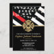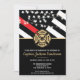 Esta invitación de jubilación de bombero presenta una bandera de bomberos con rayas negras y blancas, y una franja de línea roja delgada también. Una insignia de bombero se encuentra encima de todos los detalles de la fiesta para la fiesta de jubilación del bombero, teniente o jefe que se jubila. Las invitaciones también se pueden personalizar para un graduado de la academia de bomberos.