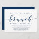Tarjeta de invitación de boda fugaz con tema azul marino elegante y letra moderna (Desayuno Brunch de Felices para Siempre). Es perfecta para su celebración de boda fugaz casual junto al lago.