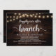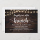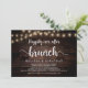 Hermosa celebración de desayuno Brunch Felices para Siempre, tarjeta de anuncio / invitación de boda de Huida, en diseño de madera de granja rústica y luces de cadena. Esto es perfecto para la recepción de su boda y la fiesta de celebración después de la boda. Agregue sus detalles en letra / tipografía coincidente.