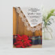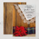 Invite a los invitados a celebrar a la recién casada y al novio la mañana después de su ceremonia de matrimonio en diciembre con la encantadora Invitación de Desayuno Campestre de Poinsettia Rústica y Cuadros después de la boda de invierno. Esta informal pero elegante invitación de desayuno o almuerzo después de la boda de estilo rancho o granja presenta una fotografía floral encantadora de una flor de poinsettia de Navidad roja, cinta de cuadros azules y un pañuelo de lino vintage blanco deslucido con encaje y un fondo de madera de granero marrón rústico.