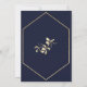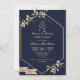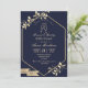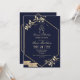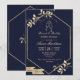 Azul oscuro y dorado champán geométrico crea un telón de fondo dramático para un brunch de fiesta de boda. Los colores temáticos elegantes y dramáticos son modernos con gran parte del diseño artístico que se encuentra en las líneas y la armonía de las diversas fuentes.