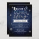 Una invitación con tema de vaqueros y diamantes moderna, elegante y chic para un brunch de Navidad en la iglesia. Cuenta con tipografía moderna y blanca y el título "Botas, Vaqueros y Brillo", con la palabra "brillo" en caligrafía moderna y superpuesta con un efecto de piedras de imitación (este es un efecto digital, no brillo o piedras reales). Dos ilustraciones de botas, una de vaquera y otra de vaquero, en acrílico moderno, completan el diseño, así como algunos copos de nieve (con el mismo efecto de piedras de imitación) para sugerir el tema invernal y navideño. Personalice cada línea de texto en esta plantilla de invitación de fiesta de Navidad para su iglesia. También es adecuada para un brunch, almuerzo o cena de Navidad de una empresa con un tema de botas, vaqueros y diamantes o brillo