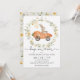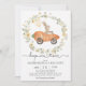 ¡Vengan a un brunch de Pascua y una búsqueda de huevos! Invite a sus invitados a su fiesta con esta invitación súper adorable que presenta un conejito lindo montando un auto de zanahoria enmarcado con una corona de flores silvestres exuberantes.