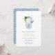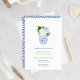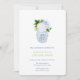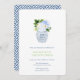 Jarrón de jengibre azul y blanco lleno de flores azules, blancas y verdes y con un soporte con patrón de "llave griega". He configurado la plantilla para un Brunch de recién casados, pero todos los campos de texto son personalizables según tus necesidades. En el reverso, puedes cambiar el color de contraste (mostrado aquí como azul oscuro) a cualquier color que desees ingresando a la herramienta de diseño (debajo del área de personalización de texto, haz clic en "personalizar más") y luego cambiando el color de fondo en el reverso.